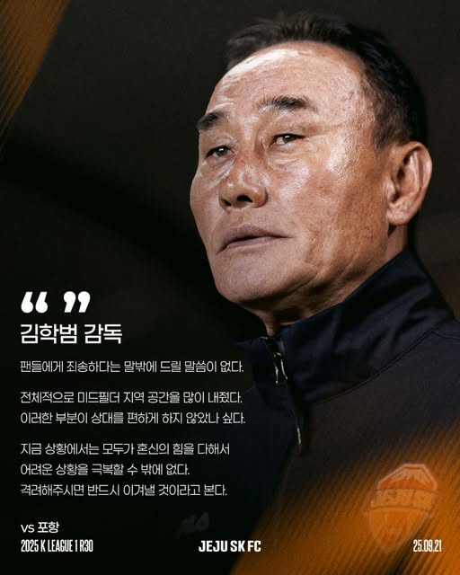 2025년 9월 27일, 프로축구 K리그1 제주 SK 구단은 김학범 감독이 성적 부진 책임을 지고 자진 사임하겠다는 뜻을 전했고, 구단은 이를 수용했다는 공식 발표를 내놓았다.