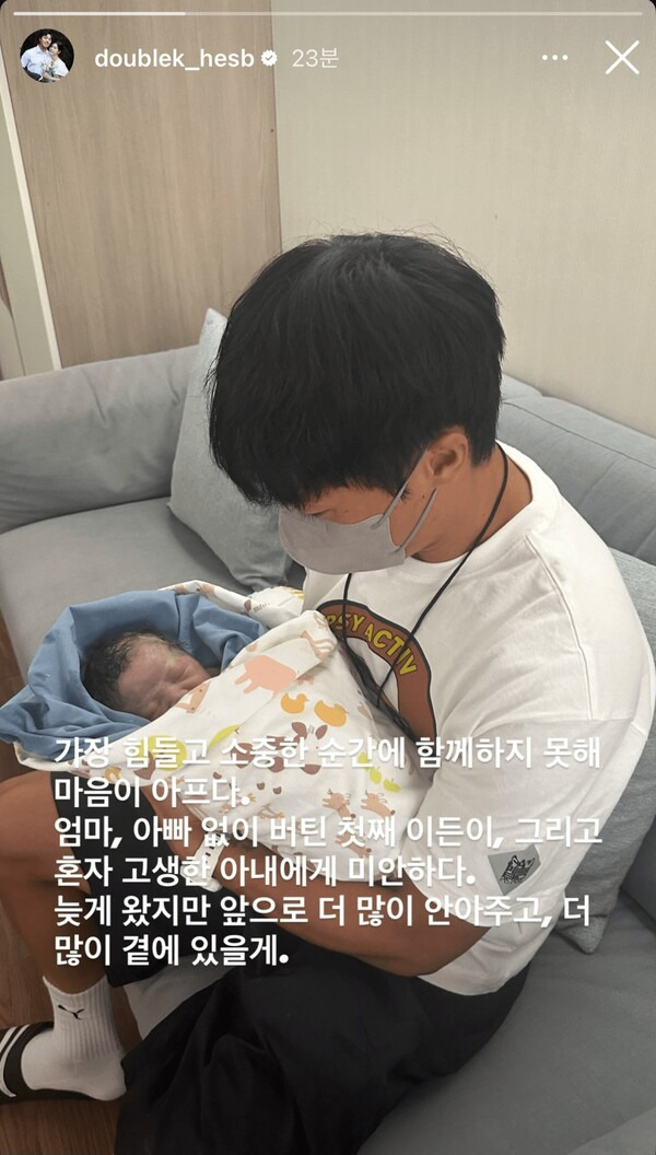 “가장 힘들고 소중한 순간에 함께하지 못해 마음이 아프다. 아내에게 미안하다.”